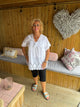Lightweight cotton top with embroidered flower and sequin decoration on the front, button back three quarter sleeves and full button fastening down the front.