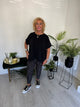 Wide leg bottoms with stripes down the side of leg, they have an elasticated waist with drawstring.