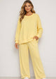 Fab Co-Ord set with elasticated waist wide leg bottoms. the top has long sleeves and round neckline with ruching on the front side.