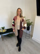 Stunning longline chunky knit edge to edge cardigan it is in autumnal patches of block colours and stripe pattern on the back.