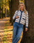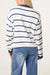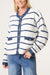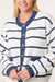 Classic blue and white striped fine knit cardigan with denim trim around the neckline, cuffs and down the front.